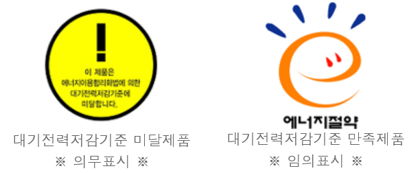 대기전력경고표지(경고라벨)는 대기전력저감기준을 만족하지 못하는 제품에 대해 소비자의 경각심을 일깨우기 위해 의무적으로 표시하는 라벨입니다. 반면, 기준을 만족하는 제품에 부착할 수 있는 에너지절약마크는 임의적으로 적용할 수 있습니다.