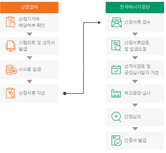인증을 받고자 하는 제조업자 및 수입업자는 고시된 기술기준과 측정방법에 따라 고효율시험기관에서 제품을 시험한 후, 시험성적서를 발급받아 인터넷으로 1년 이내에 신청을 하여야 합니다. 특히, 대상품목별로 적용범위, 시험항목, 필수 제조ㆍ검사설비 등이 상이하므로, 인증 신청 이전 고시 내용을 반드시 확인할 것을 권고 드립니다.